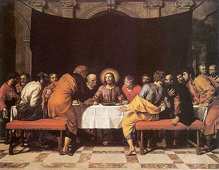 After the prayer, the major-domo laid the knife for cutting the lamb on the table before Jesus, who placed a cup of wine before him, and filled six other cups, each one of which stood between two Apostles. Jesus blessed the wine and drank, and the Apostles drank two together out of one cup. Then our Lord proceeded to cut up the lamb; his Apostles presented their pieces of bread in turn, and each received his share. They ate it in haste, separating the flesh from the bone, by means of their ivory knives, and the bones were afterwards burnt. They also ate the garlic and green herbs in haste, dipping them in the sauce. All this time they remained standing, only leaning slightly on the backs of their seats. Jesus broke one of the loaves of unleavened bread, covered up a part of it, and divided the remainder among his Apostles. Another cup of wine was brought, but Jesus drank not of it: ' Take this,' he said, ' and divide it among you, for I will not drink from henceforth of the fruit of the vine, until that day when 1 shall drink it with you new in the kingdom of my Father ' (Matt. xxvi. 29). When they had drunk the wine, they sang a hymn; then Jesus prayed or taught, and they again washed their hands. After this they sat down.